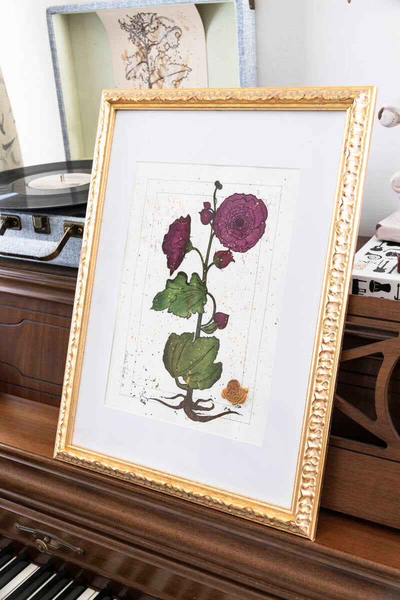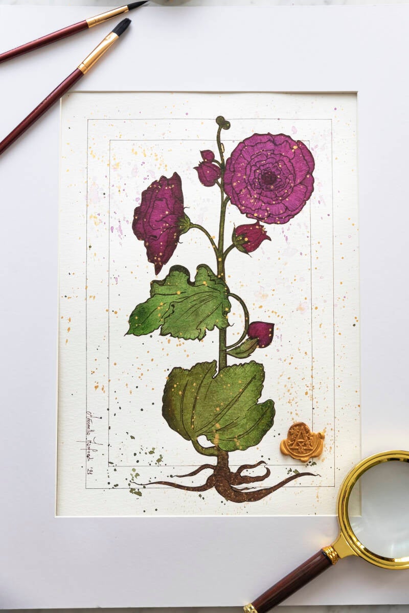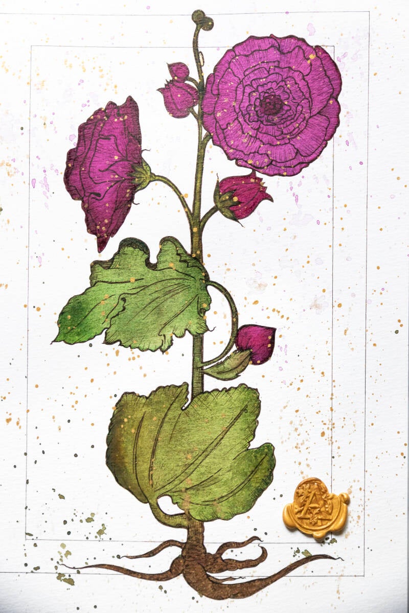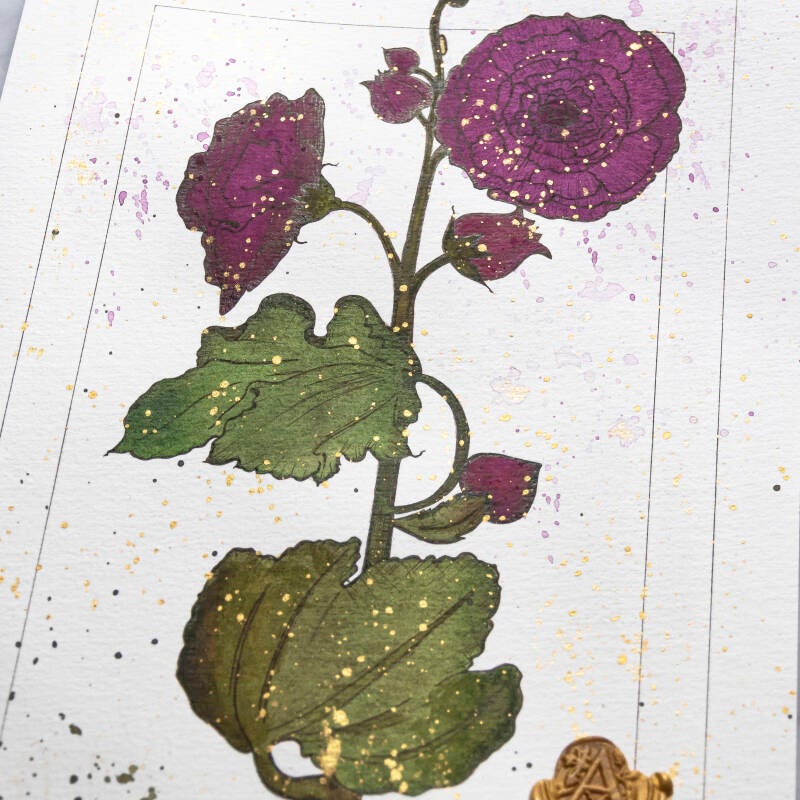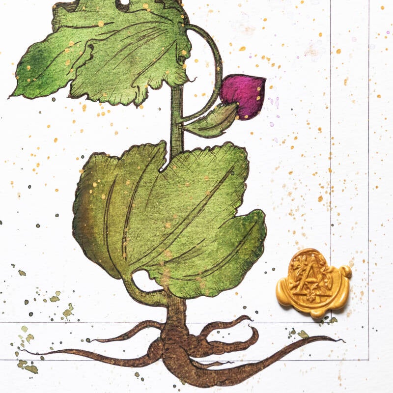 In tecnica mista - acquerello e inchiostro, con inserto in ceralacca - lavorato con cura Certosina e rispetto delle antiche tradizioni amanuensi.